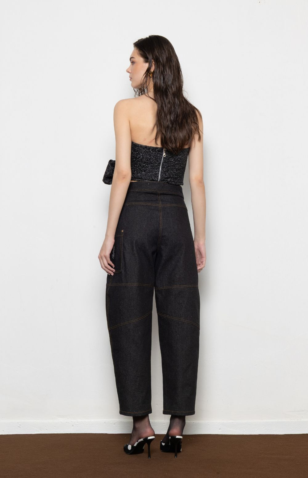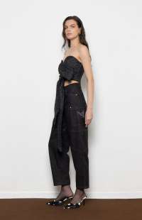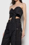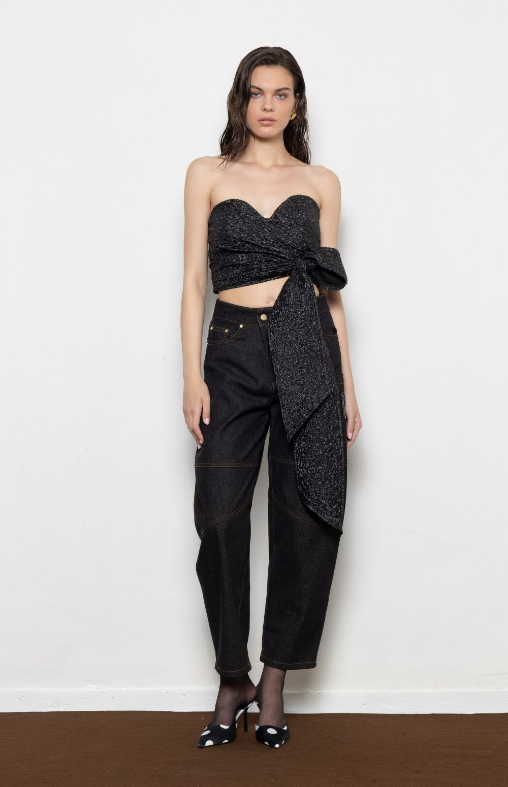 Elevated edge. This strapless black top is crafted from a textured fabric that catches the light with subtle shine. Designed with a sculpted sweetheart neckline and an exaggerated front tie detail, it creates a bold, feminine silhouette. A statement piece that transitions effortlessly from evening drinks to after-dark events.