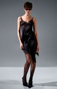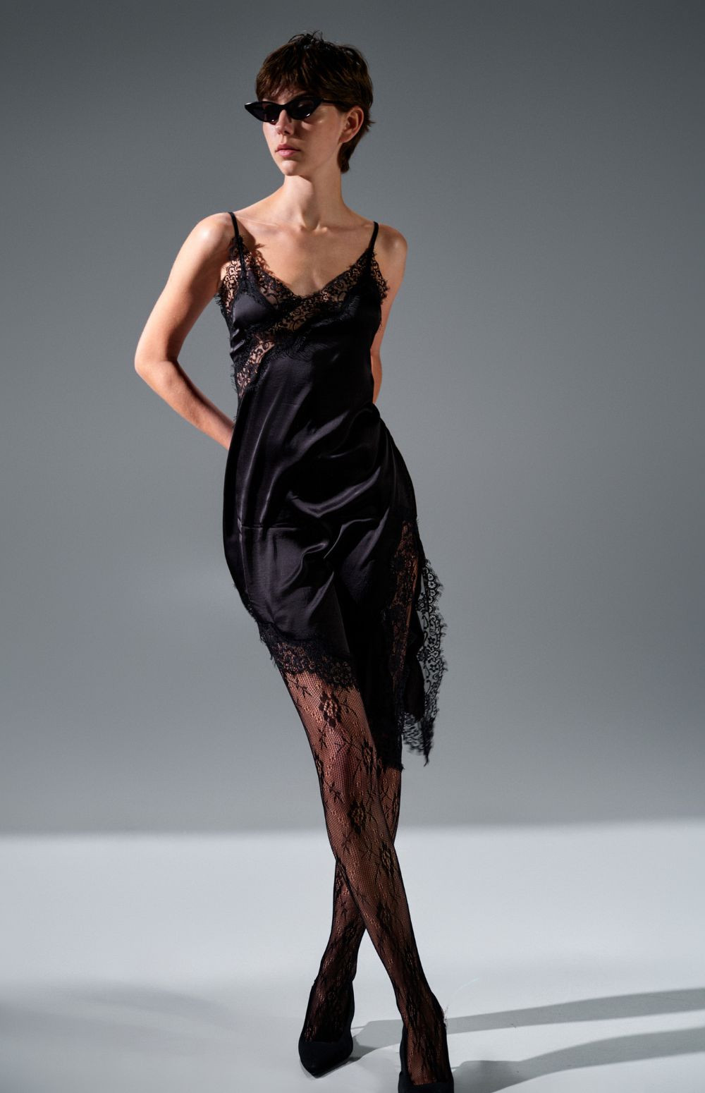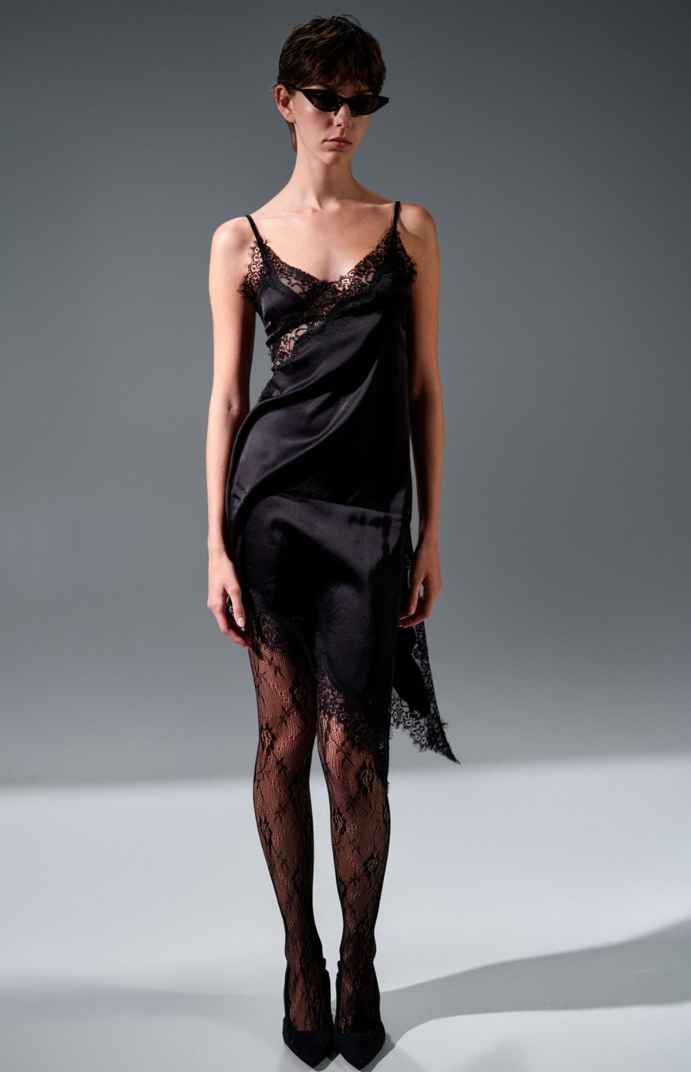 Satin dress with V-neck. Made of viscose blend. It features thin adjustable shoulder straps. Lace applique detail. Asymmetrical bottom with slit.