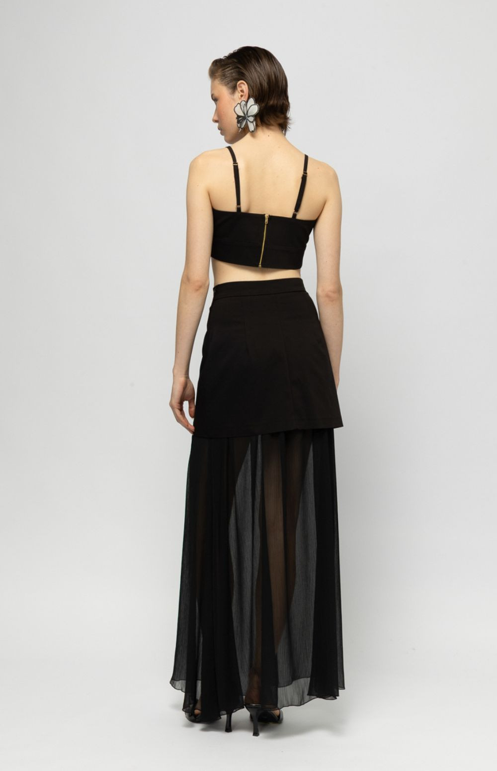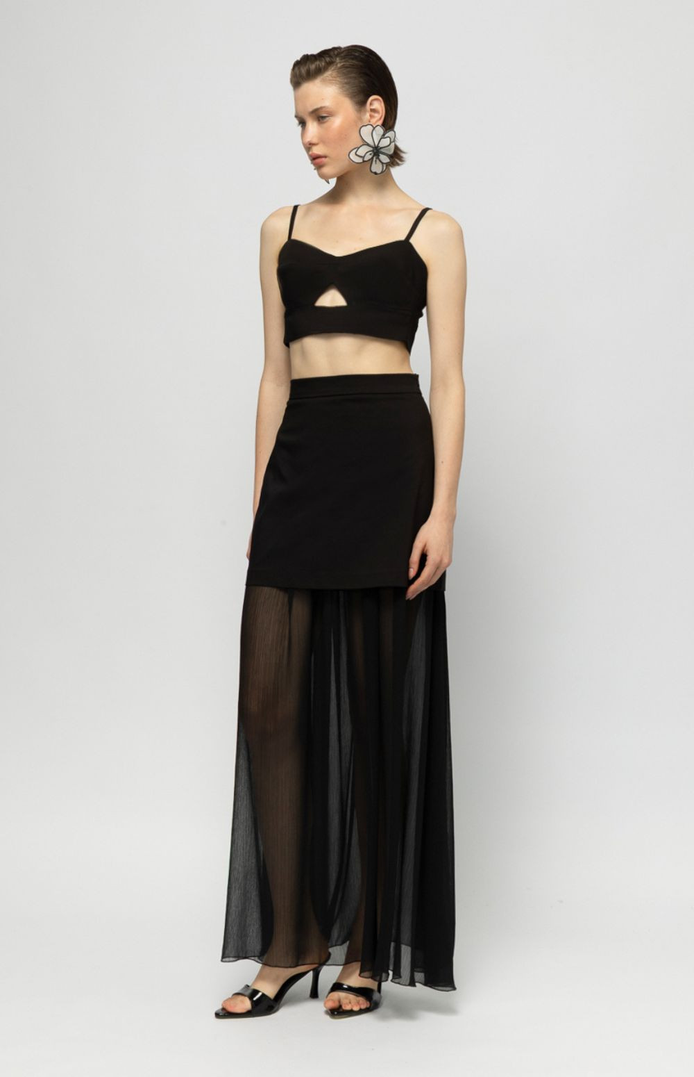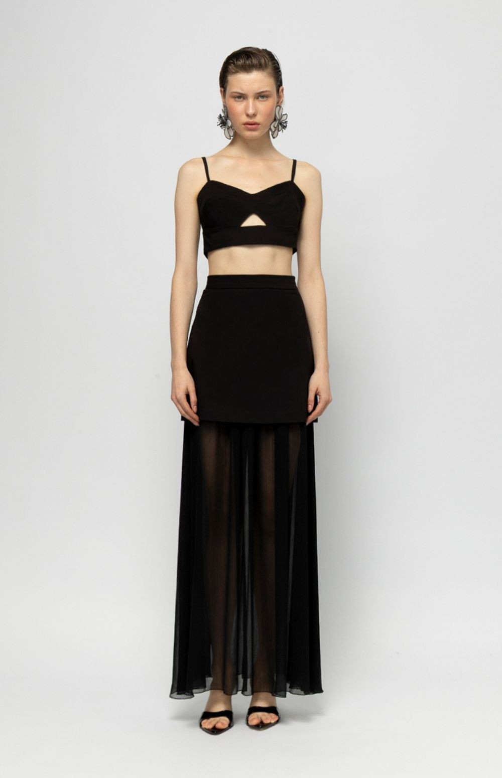 A black maxi skirt with a sheer underlayer and clean, modern silhouette — elegant, lightweight, and effortlessly chic.
