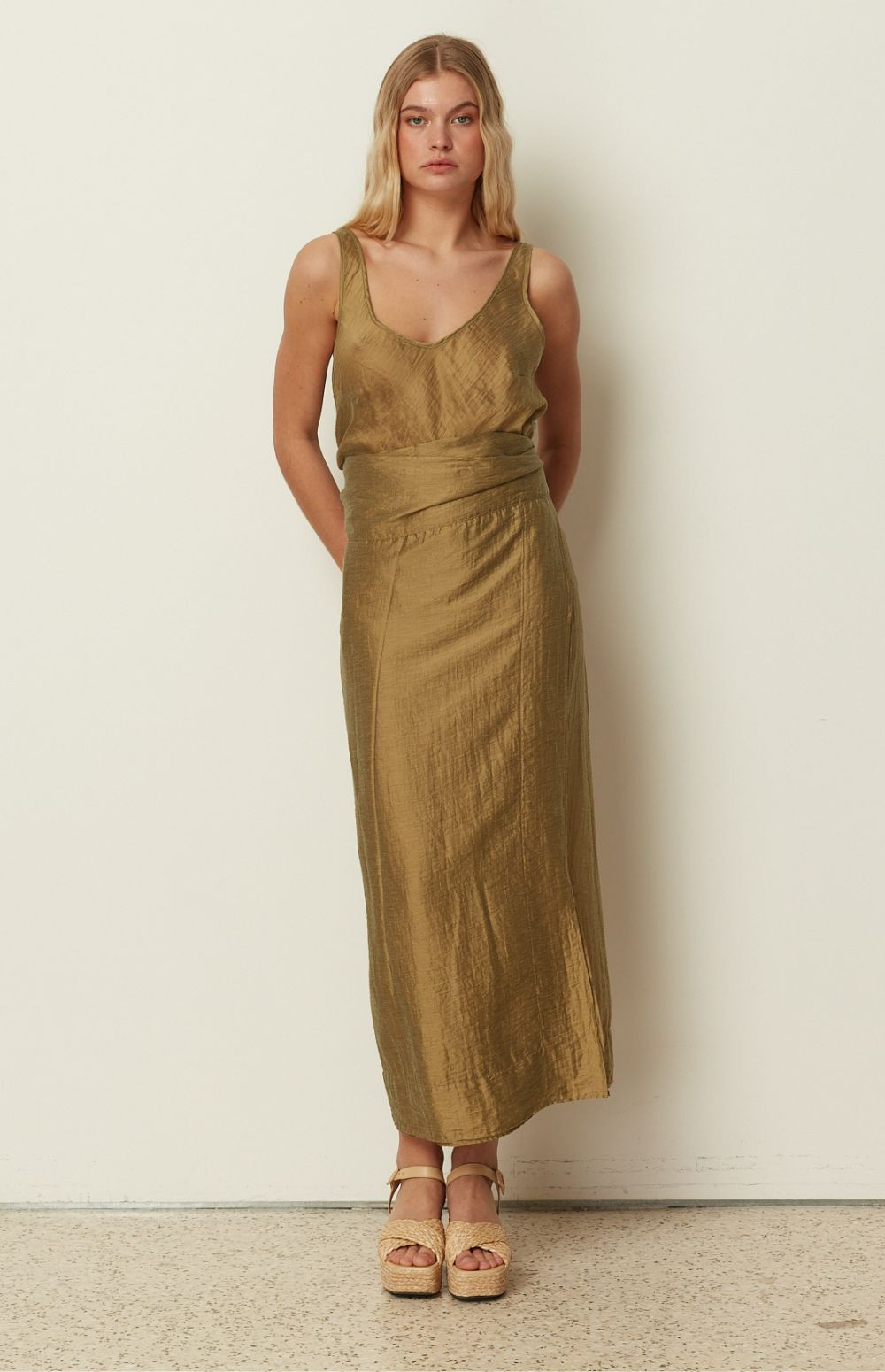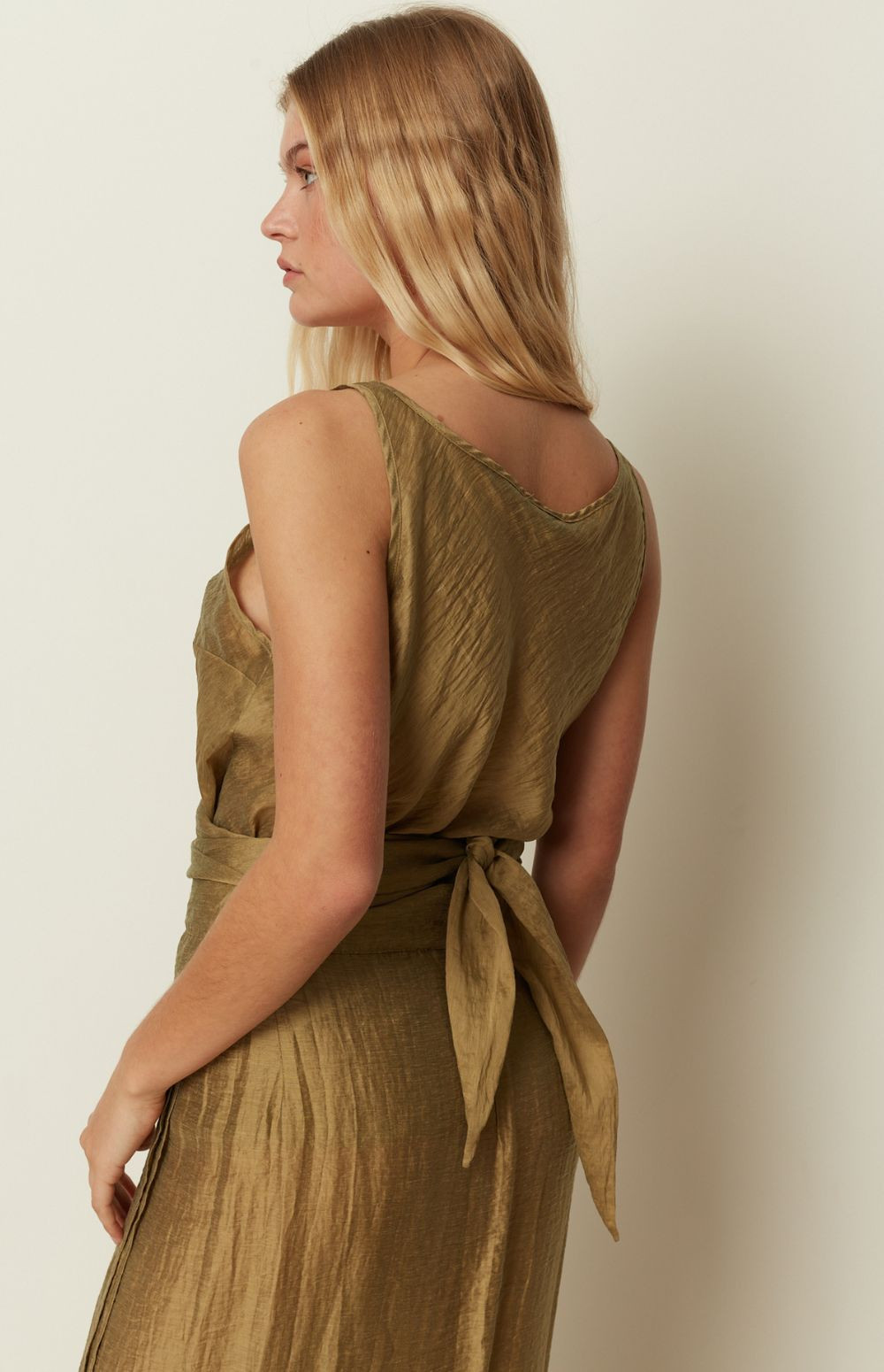 The design is defined by a wrap-style waist panel that cinches and flatters the silhouette while keeping the look effortless and modern.