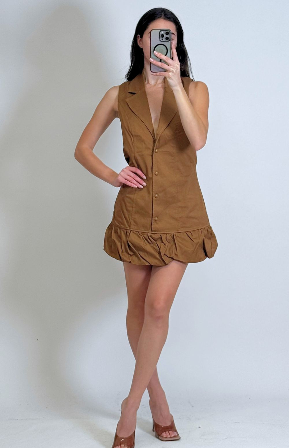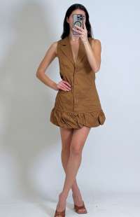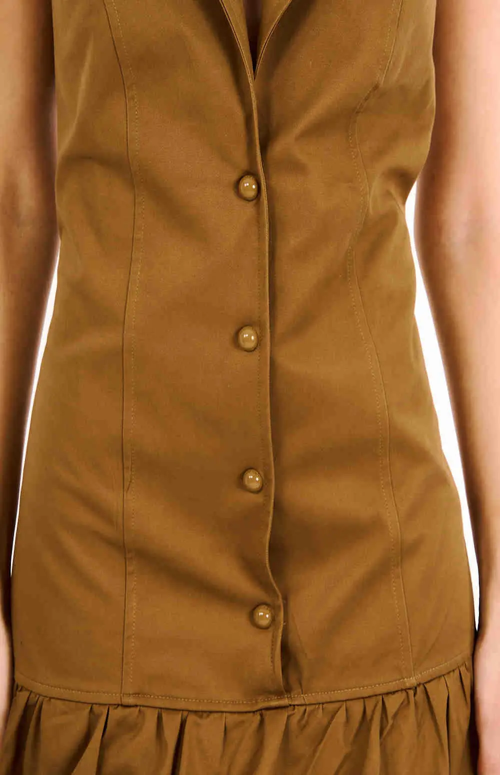 Tailored woven button down frill hem shift dress. It features button detailing and a frilled hem for a subtle romantic touch.