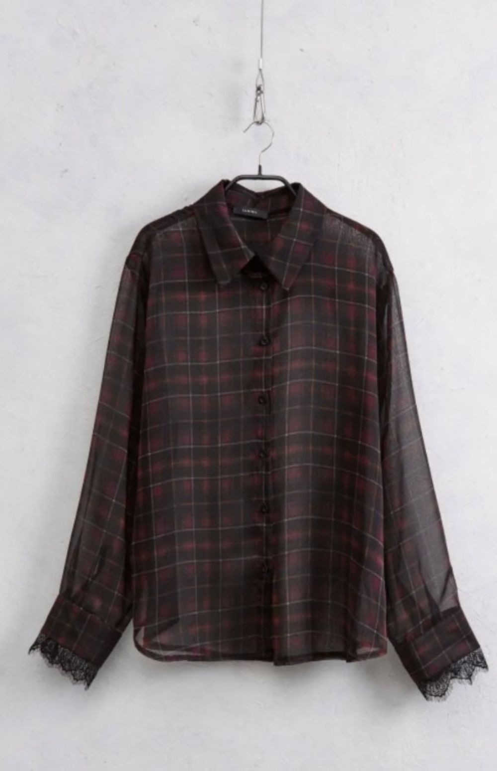 A subtle yet bold addition to your wardrobe. The sheer plaid shirt combines the classic charm of tartan with an air of sensual femininity. Lace-detailed cuffs break up the structure of the plaid, adding a romantic touch to a quintessentially masculine pattern.