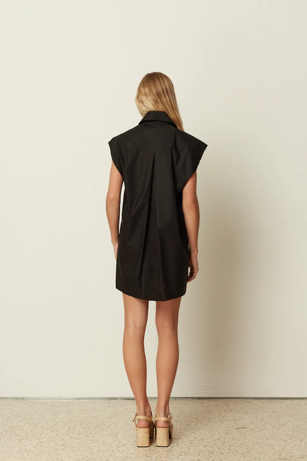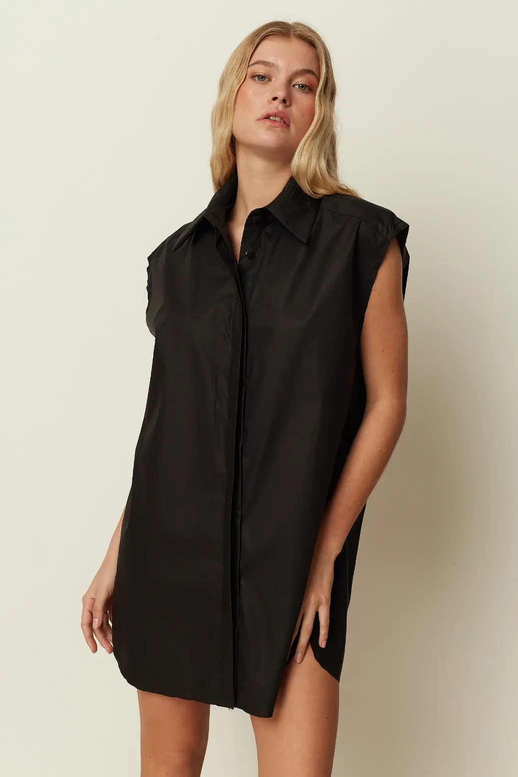A modern wardrobe essential by ckontova, this sleeveless shirt dress is cut in a relaxed, straight silhouette for effortless day-to-night styling. Featuring a classic pointed collar and button-down front, it’s finished with a smooth, lightweight feel and a clean mini length. Wear it on its own with flat sandals, belt it to define the waist, or layer it over trousers for a contemporary, oversized look.