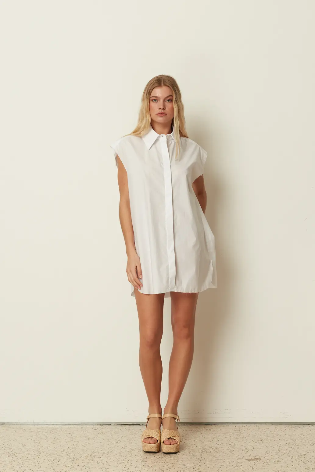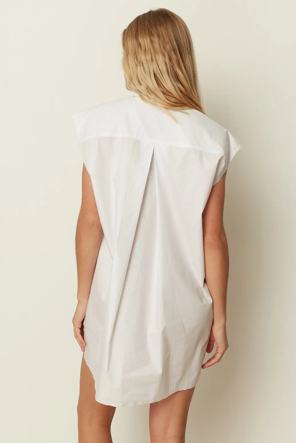 A modern wardrobe essential by ckontova, this sleeveless shirt dress is cut in a relaxed, straight silhouette for effortless day-to-night styling. Featuring a classic pointed collar and button-down front, it’s finished with a smooth, lightweight feel and a clean mini length. Wear it on its own with flat sandals, belt it to define the waist, or layer it over trousers for a contemporary, oversized look.