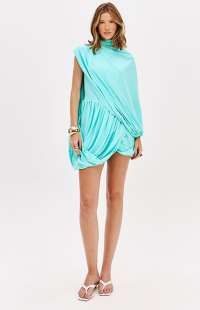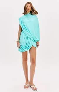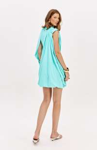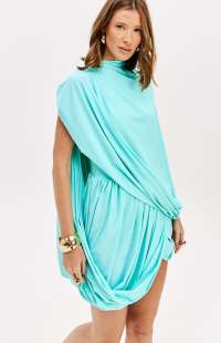 This short dress is made from lightweight knit fabric with a soft feel and a loose fit. It features a wrap design with a single long sleeve, a high neckline, and a twist detail at the hem that creates subtle volume. Boldness and elegance for your look!