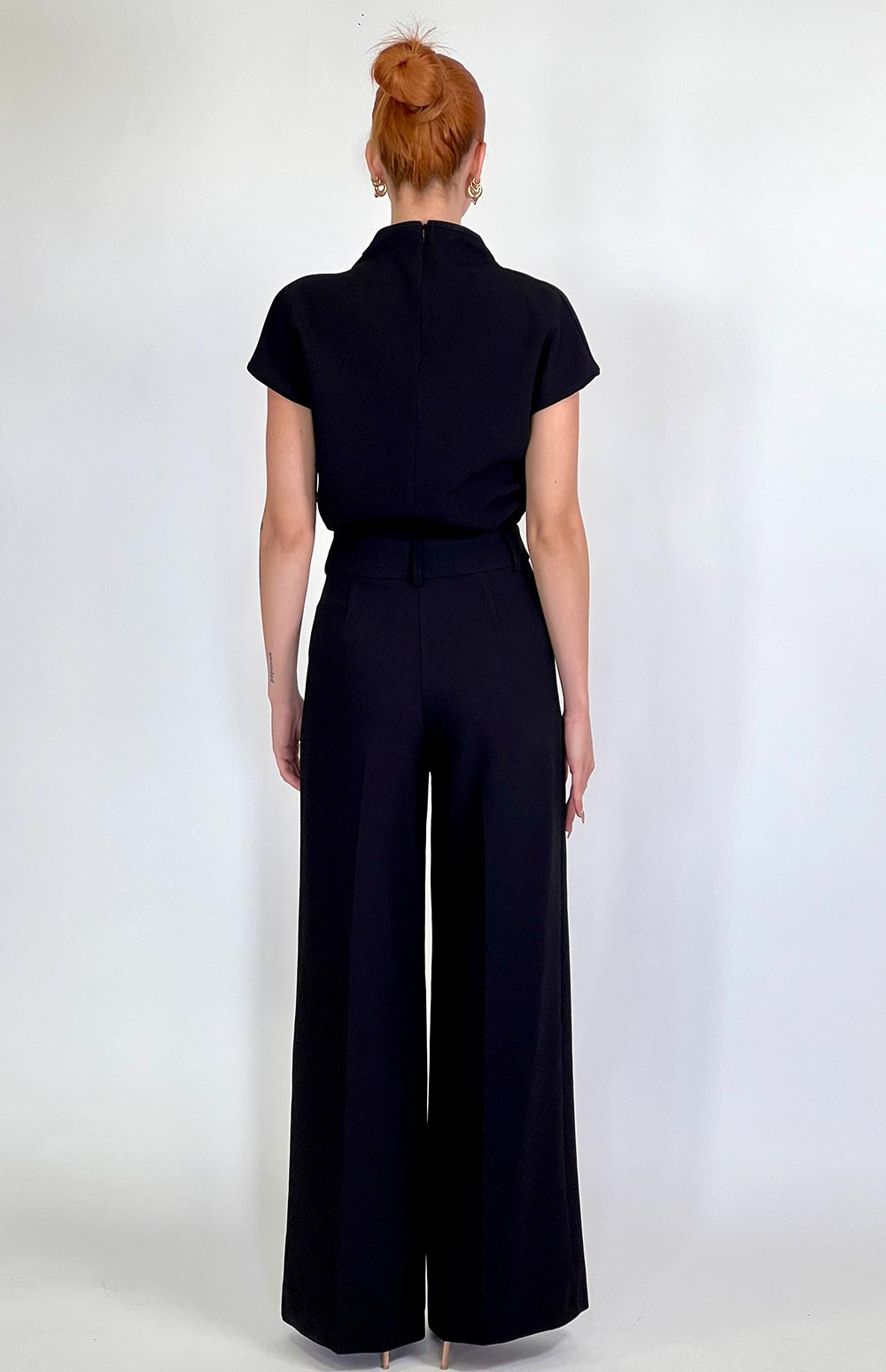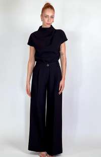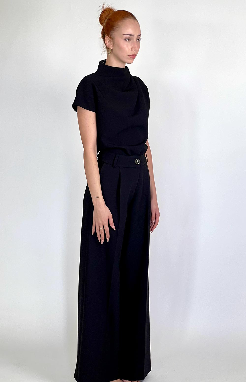 The cross-neck top, detailed with a sleek back zipper, embodies elegance in a regular fit. Paired with wide-leg pants featuring a front zip, button closure, and side pockets.