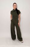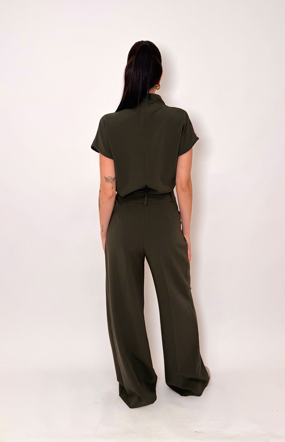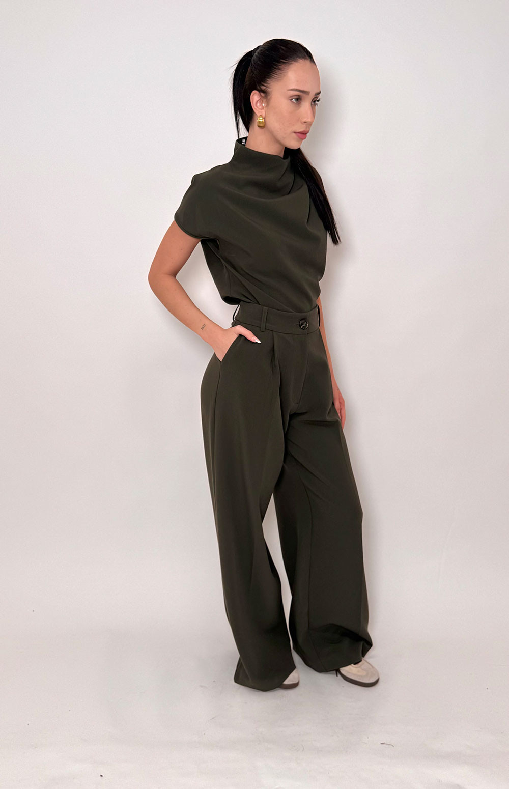 The cross-neck top, detailed with a sleek back zipper, embodies elegance in a regular fit. Paired with wide-leg pants featuring a front zip, button closure, and side pockets.