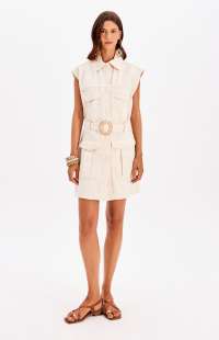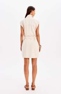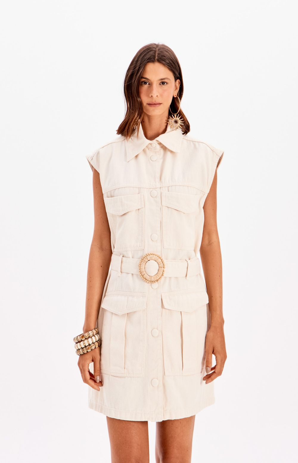 Denim shirtdress. It features a button-down front with a collar, sleeveless design, and distinct front cargo pockets.