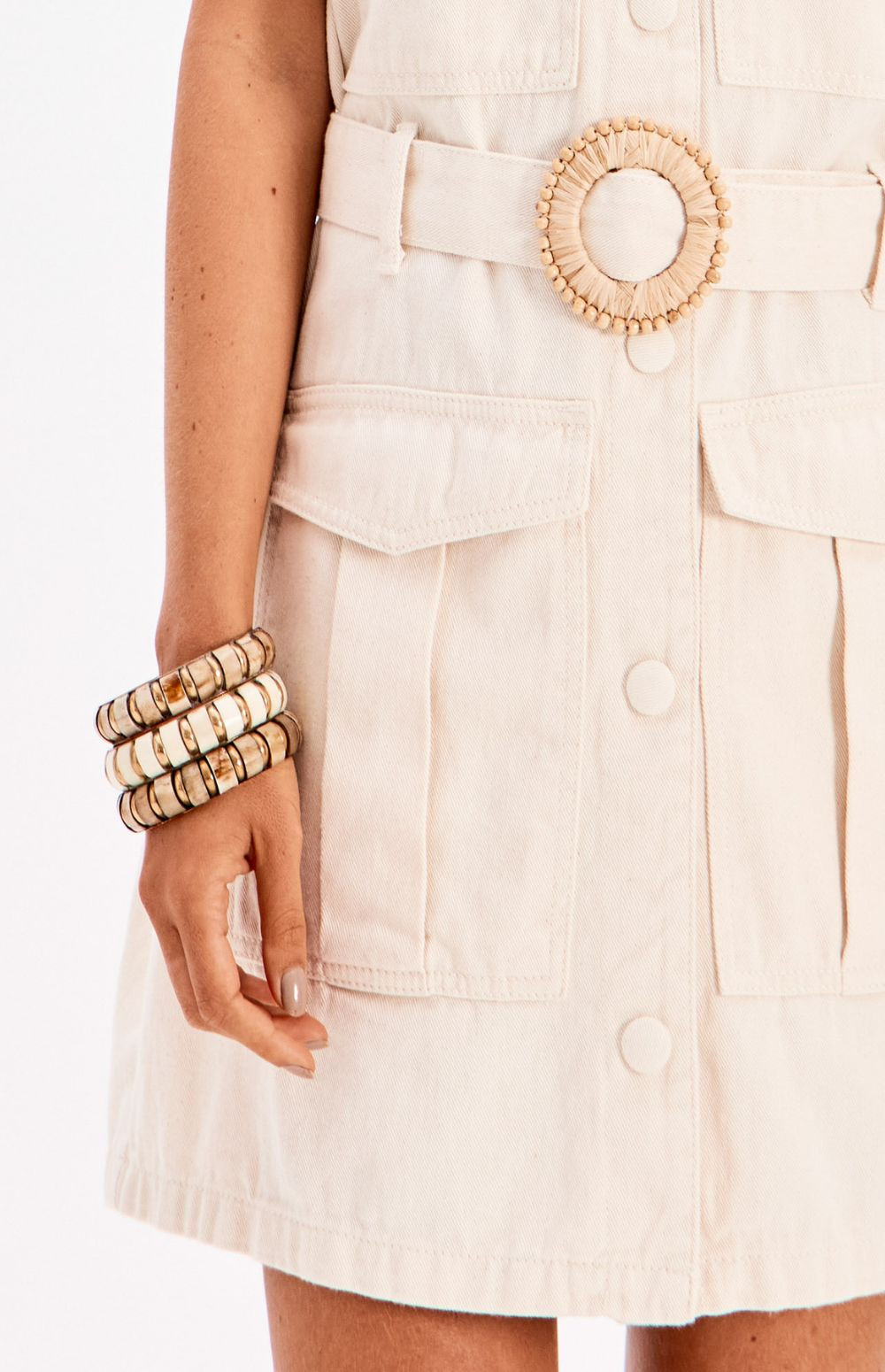 The Belt: The dress is styled with a wide beige woven belt featuring a prominent circular buckle.