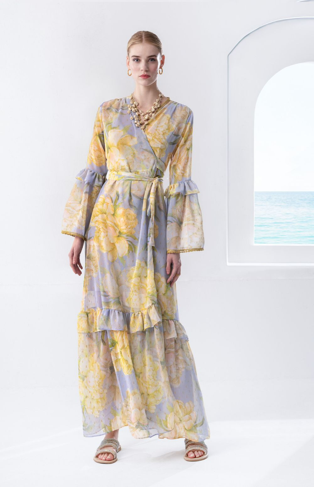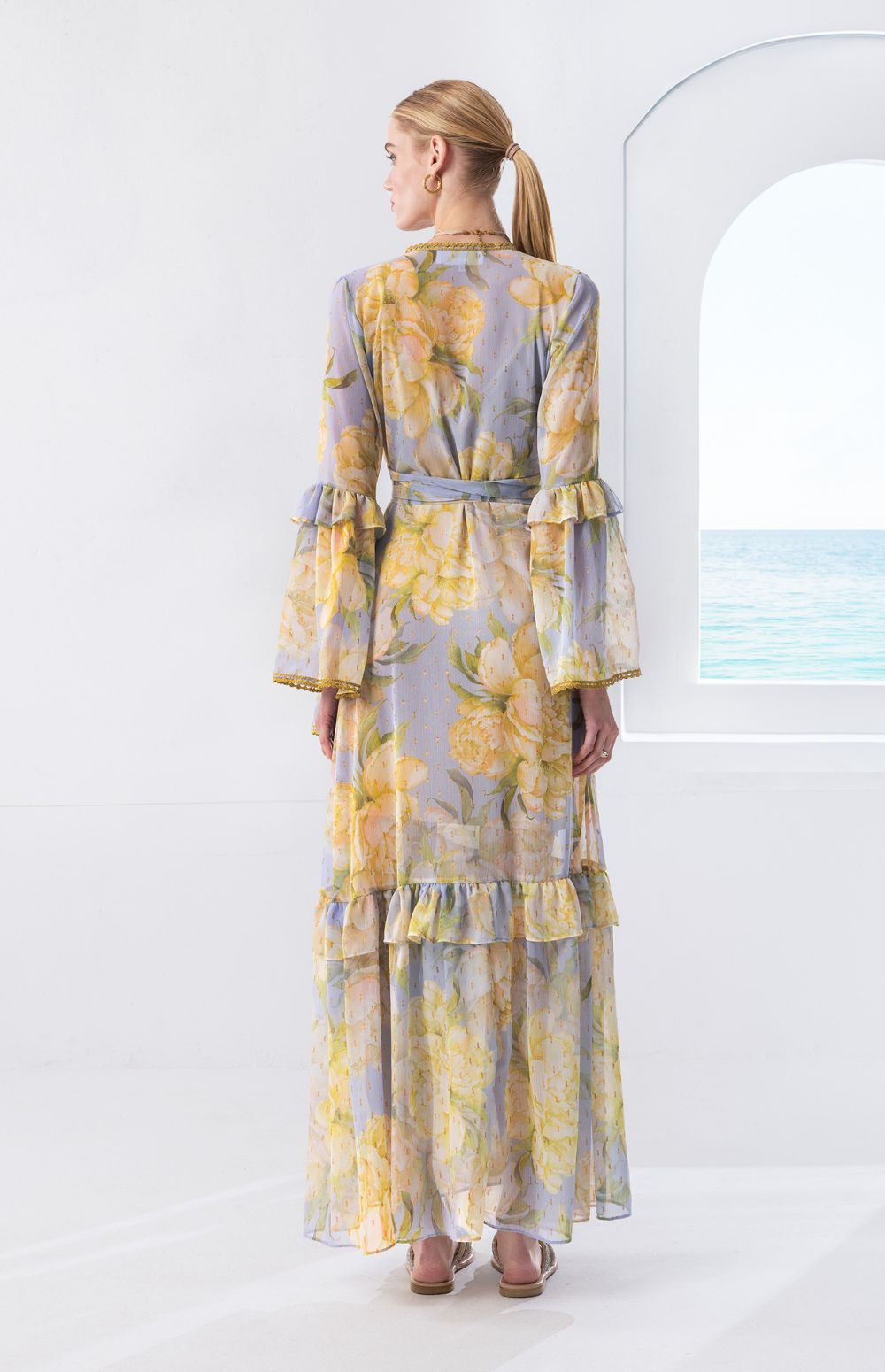 Long sleeves with double ruffle detail and a softly flared skirt create graceful movement and an airy summer feel. Perfect for summer occasions, baptisms, island weddings and special events.