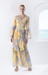 A flowing maxi kimono-dress in soft lavender with a striking yellow floral print. The wrap neckline flatters the silhouette, while the self-tie waist belt enhances the feminine shape naturally.
