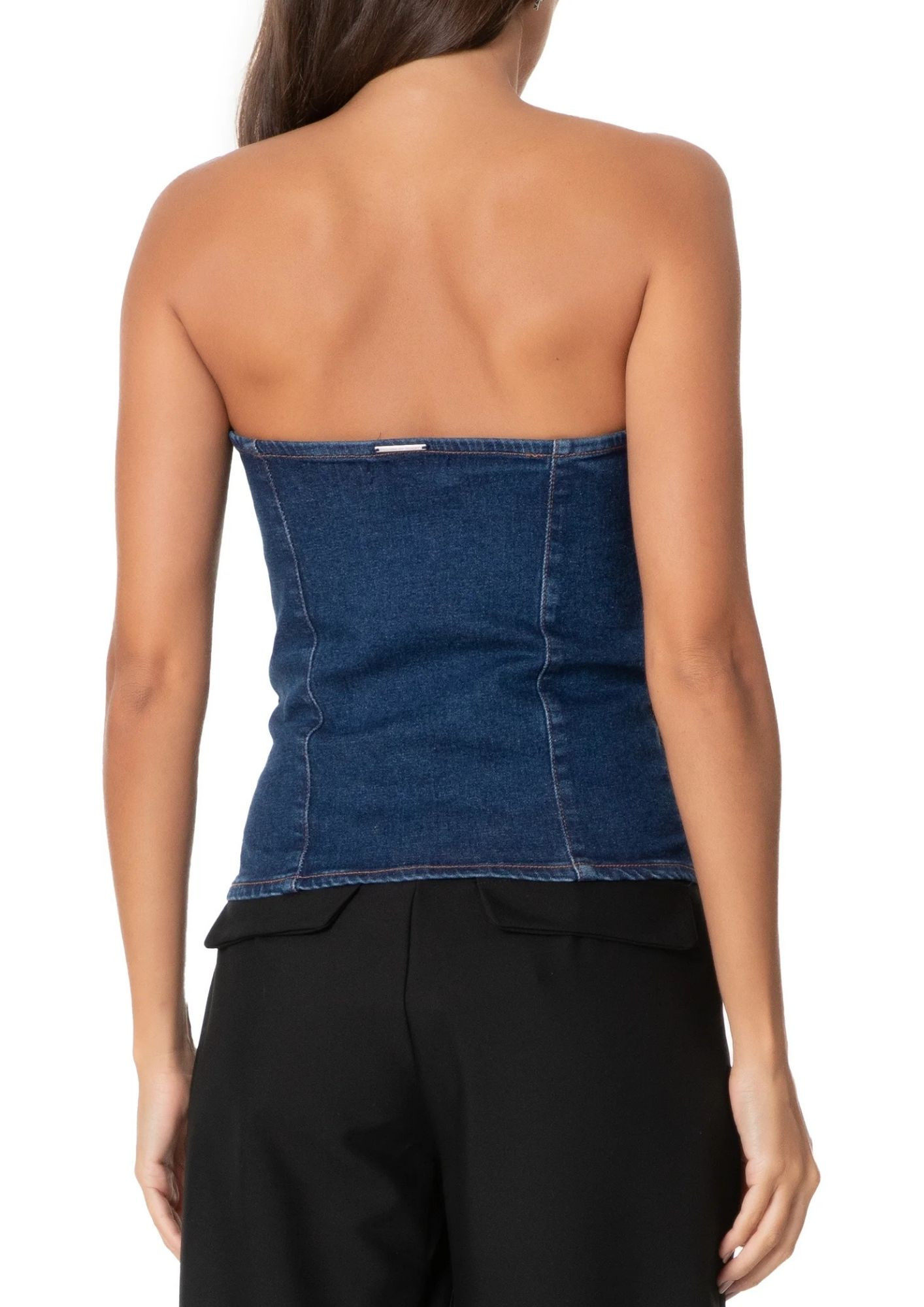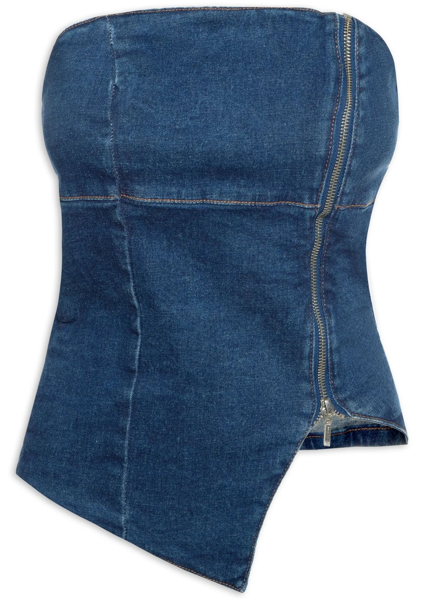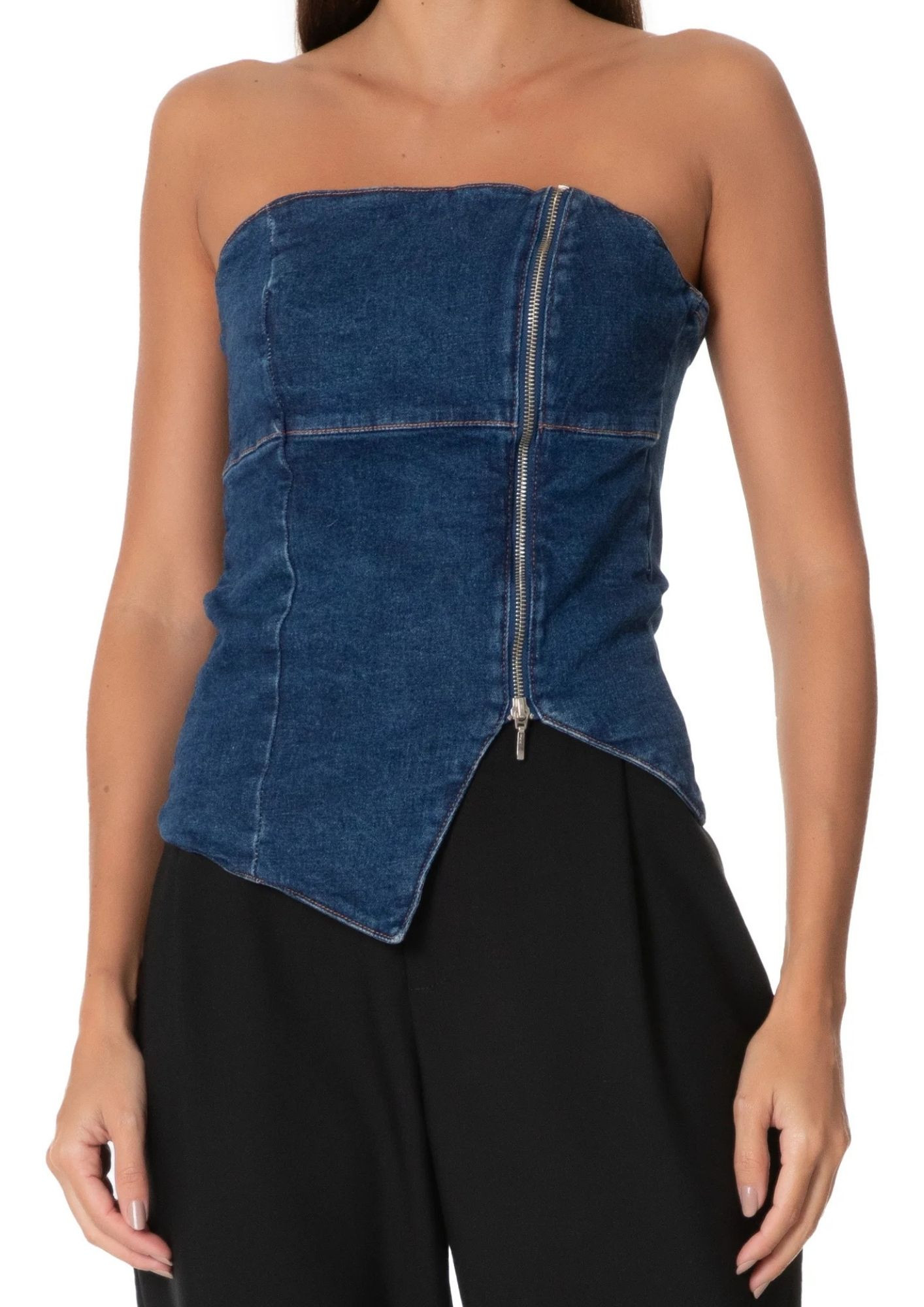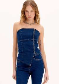 The blue top is made of twill with a low-stretch denim wash . The strapless, body-hugging piece features a straight neckline, back and front cutouts, no padding, cropped length*, asymmetrical hem at the front, and a front zipper closure.