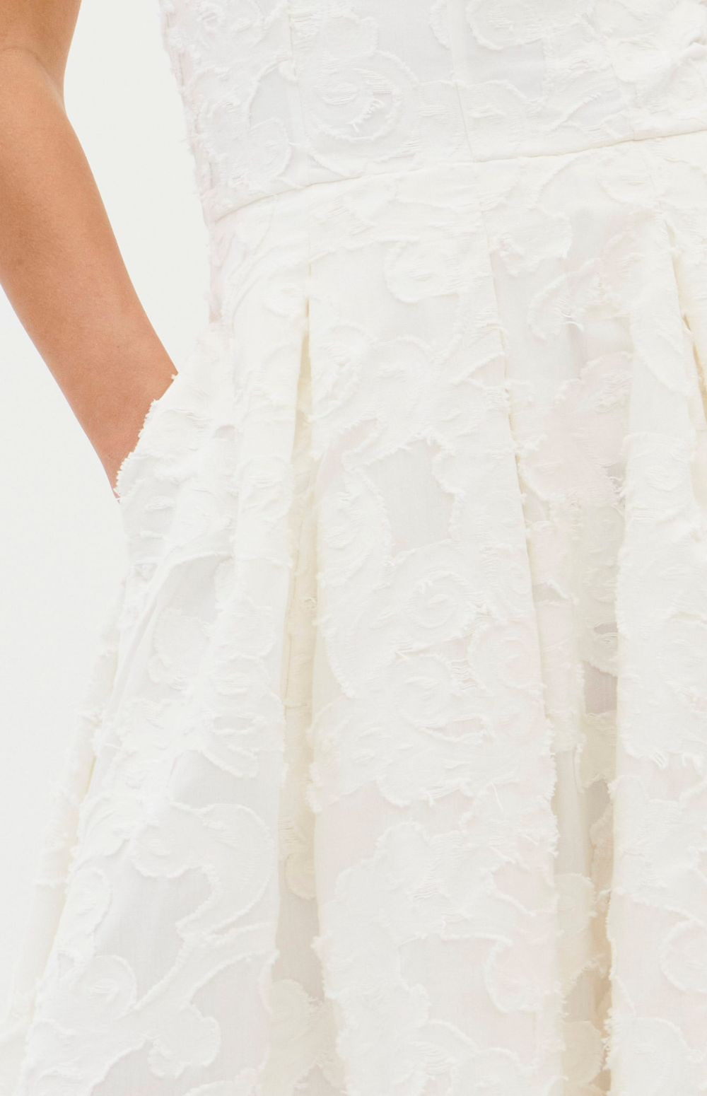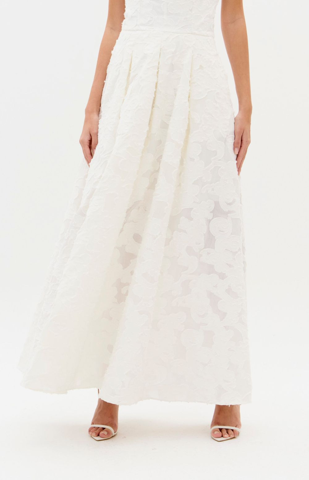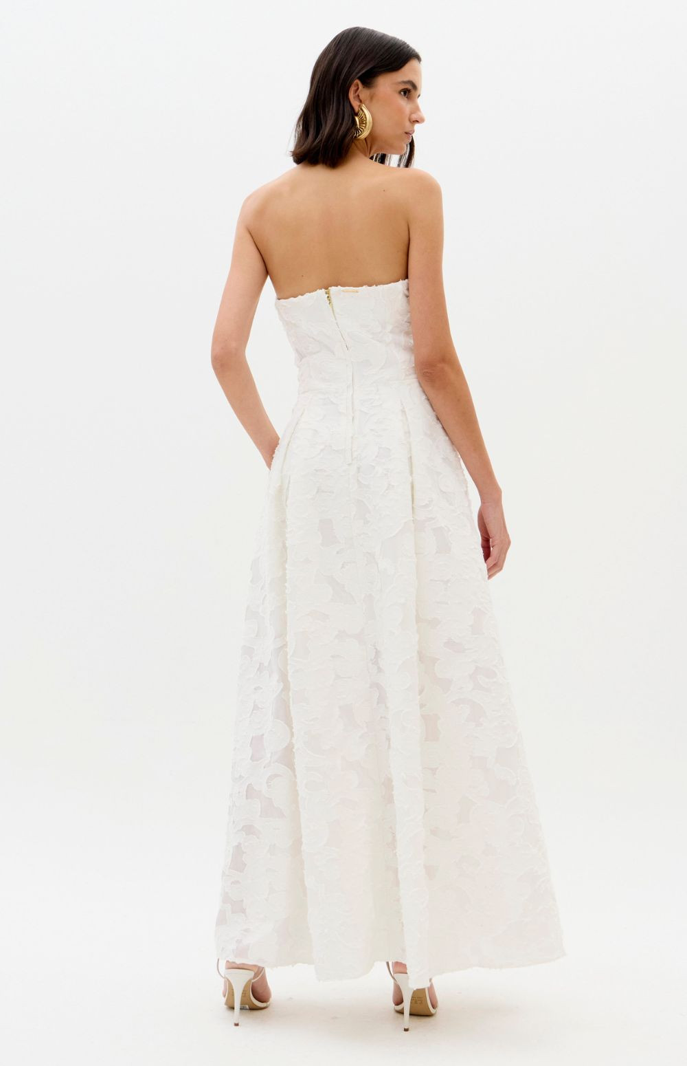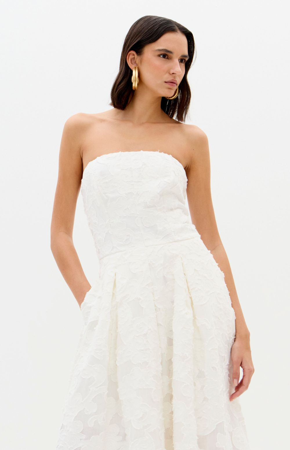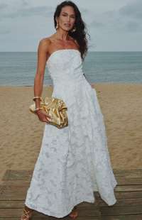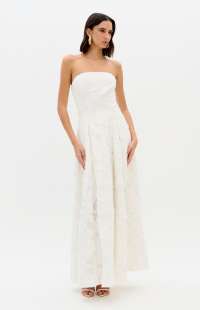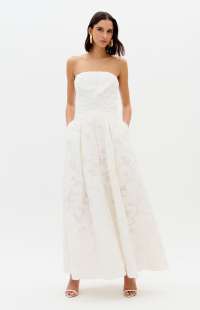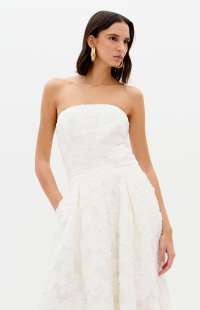 The image features a Lança Perfume strapless dress. This elegant piece is characterized by its jacquard floral design and structured, a-line silhouette