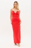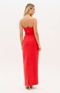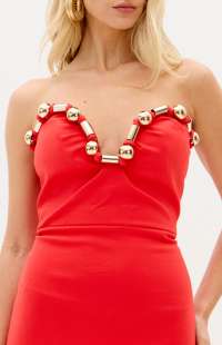 Made from knit fabric, this strapless super midi dress features a body-hugging fit, a back slit, and a zipper closure. The deep neckline with structured cups is outlined with metallic embellishments, creating a bold look. Perfect for making a statement!