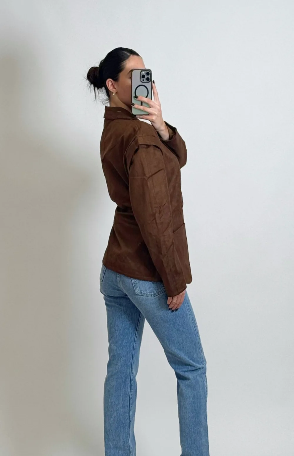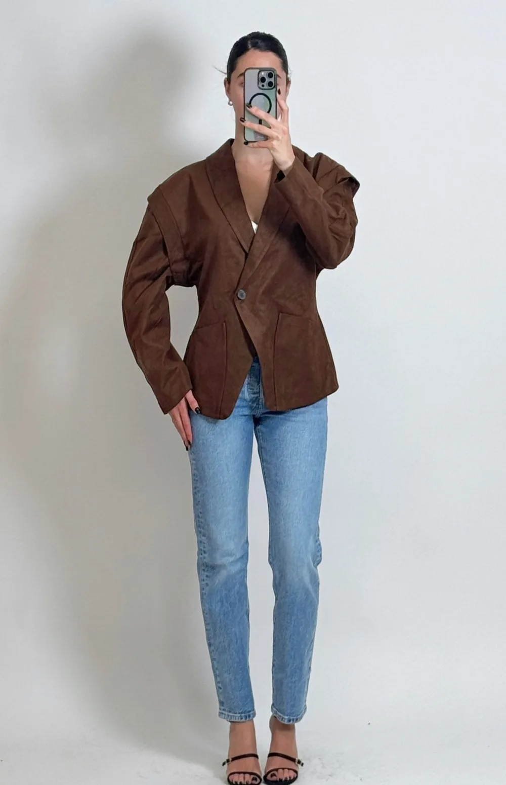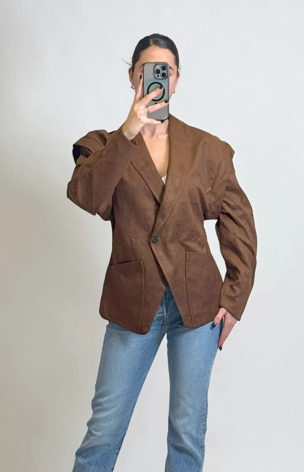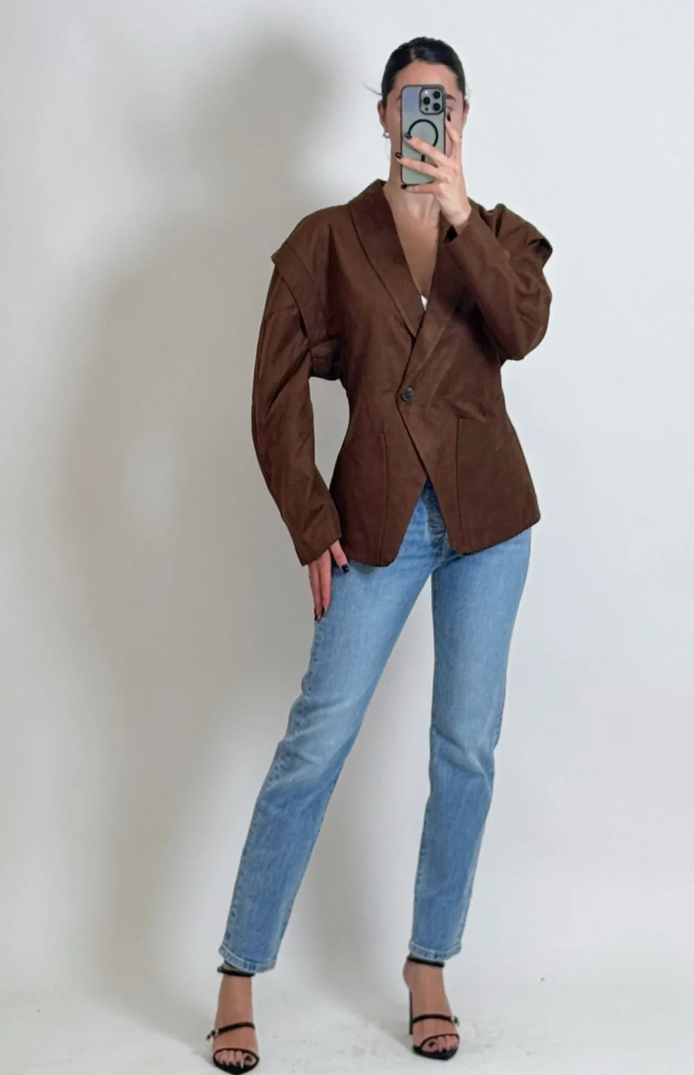 Make a powerful and sophisticated statement with this unique structured suede jacket.