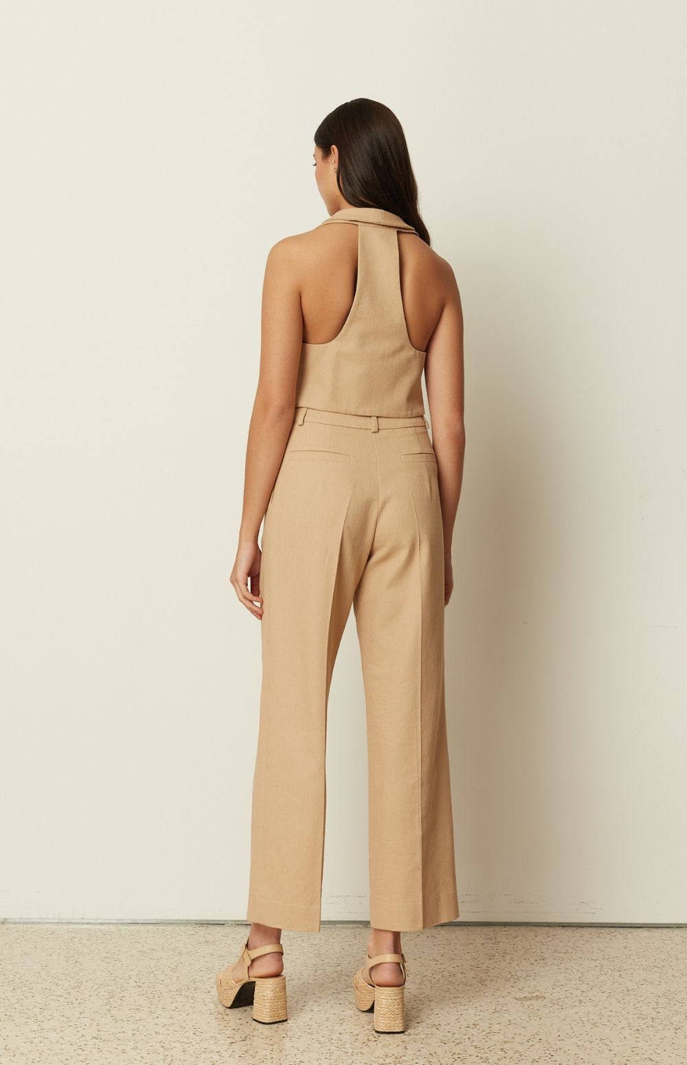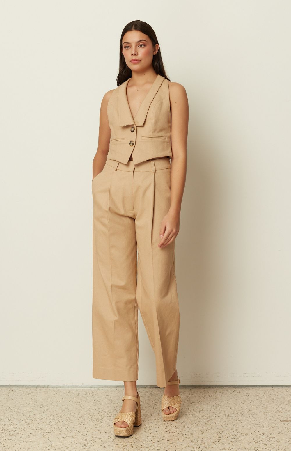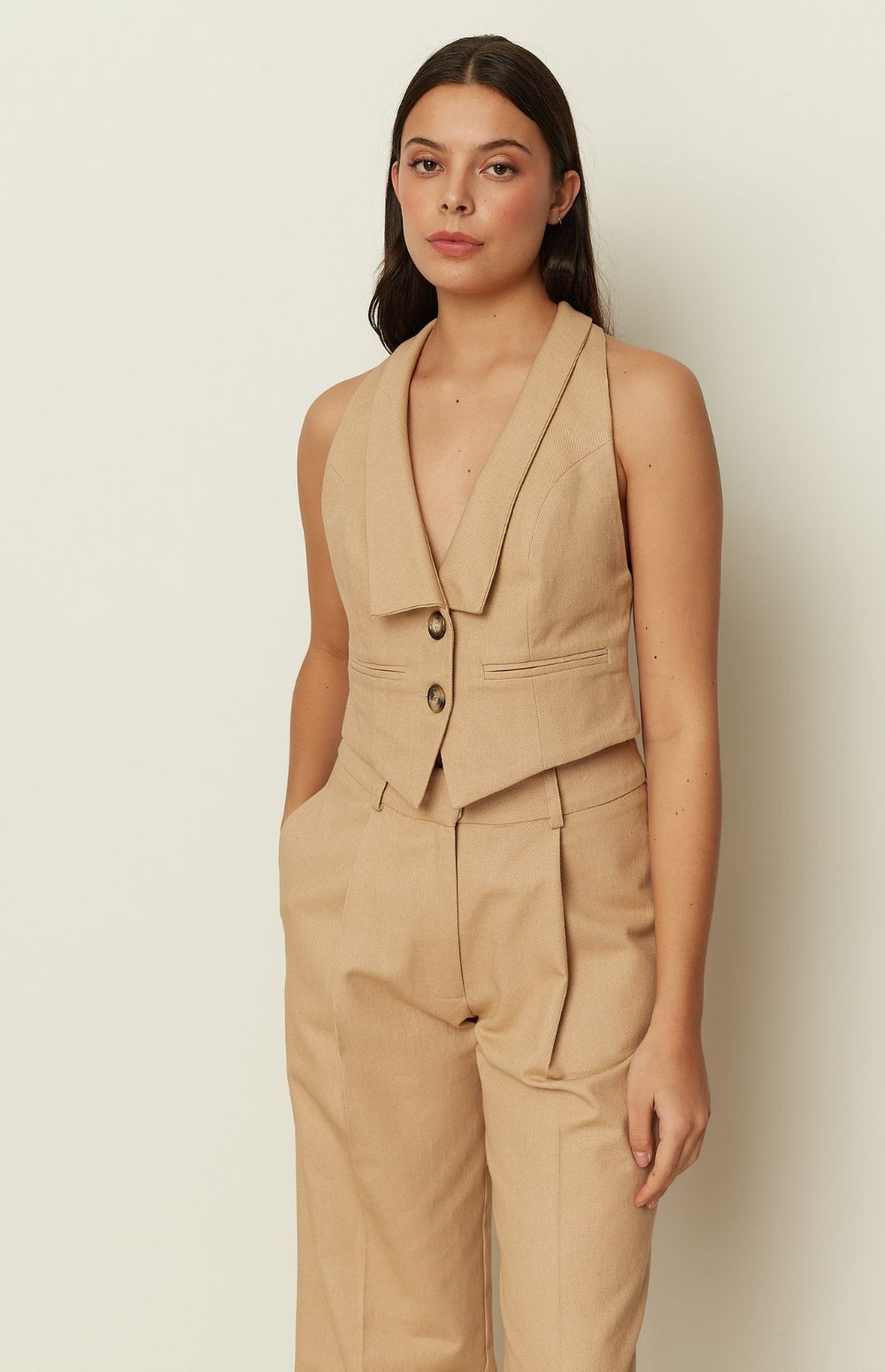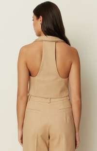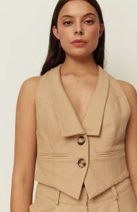 A sharp tailoring piece by ckontova, this sleeveless vest is designed in a structured, cropped silhouette with a deep V-neckline and clean lapel-style front. Finished with a two-button closure and subtle welt pocket detailing, it creates a sleek, elongated line while remaining effortless to wear. Style it with the matching mini skirt for a modern co-ord set, or pair it with wide-leg trousers and heels for elevated evening dressing.