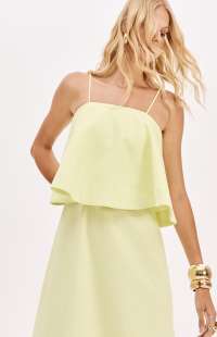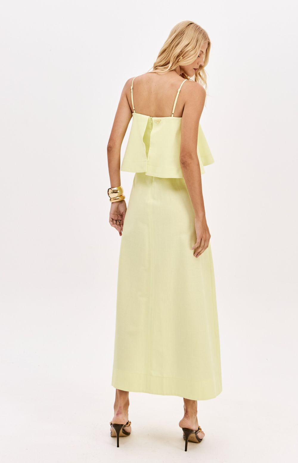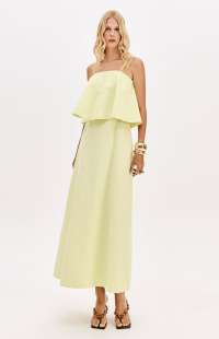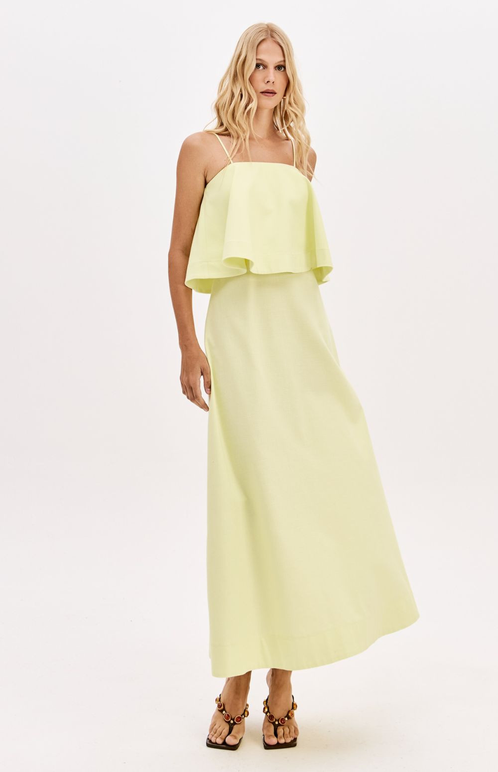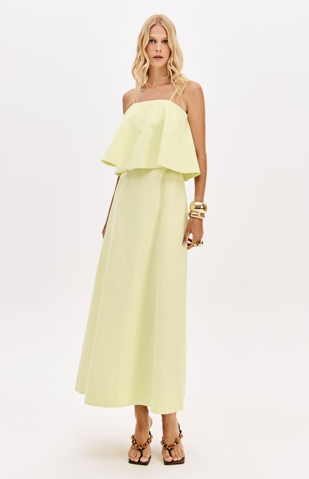 Made from a structured, non-stretch fabric, this super midi dress with adjustable straps features a straight neckline, back zipper, and a fitted bust that flares out from the hips. The highlight is the overlay detail that adds elegant volume to the design.