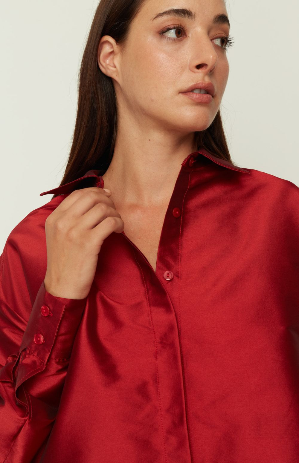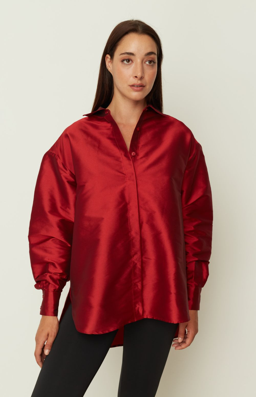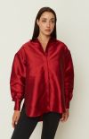 An elevated take on everyday dressing, this ensemble blends timeless elegance with contemporary structure. The satin popover shirt features a relaxed silhouette with dropped shoulders, a sleek collar, and a subtle sheen that catches the light with every movement. Paired with a voluminous A-line skirt in crisp technical fabric, this look offers refined contrast and modern femininity. Style them together for effortless polish, or mix and match to create endless wardrobe options.