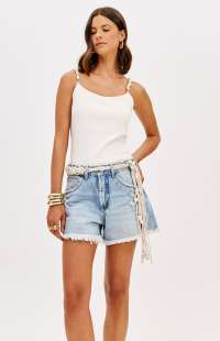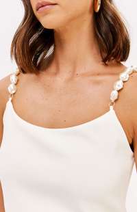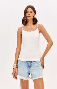 Made from a thick, soft knit fabric, this blouse features a fitted silhouette and a round neckline. The highlight is the pearl-embellished straps, which exude elegance and take center stage in the look. Wear it with lightweight jeans for a stylish outfit!