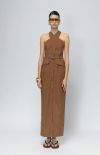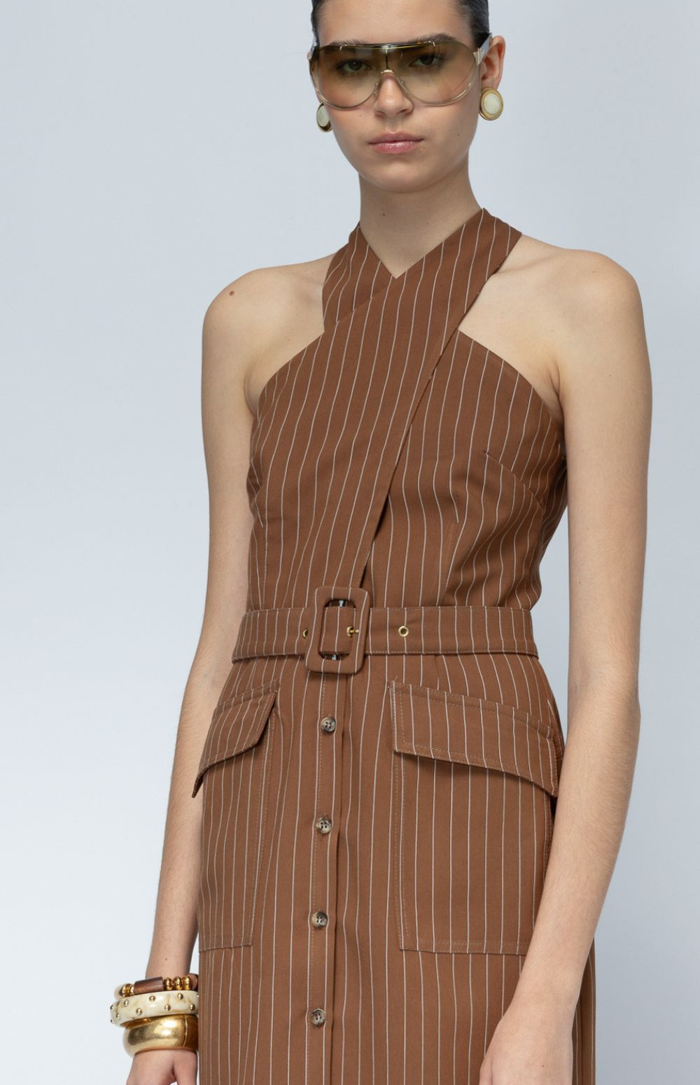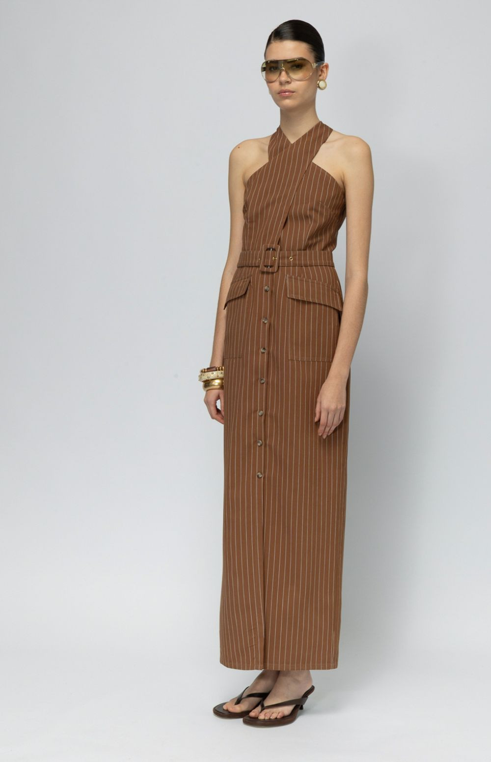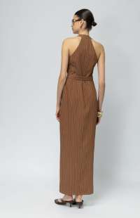 Tailored attitude. A pinstriped halter maxi dress with sharp lines and button-front detailing — structured, confident, and effortlessly cool.