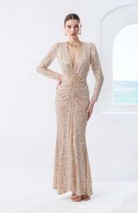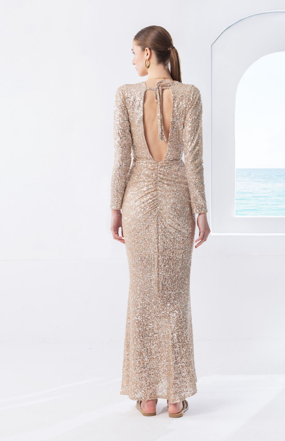 Maxi dress in a luminous champagne-gold shade, fully covered in sequins that reflect light beautifully with every movement. The deep V neckline enhances femininity, while the front ruching flatters the silhouette and defines the waist.