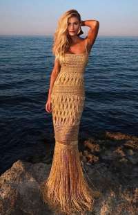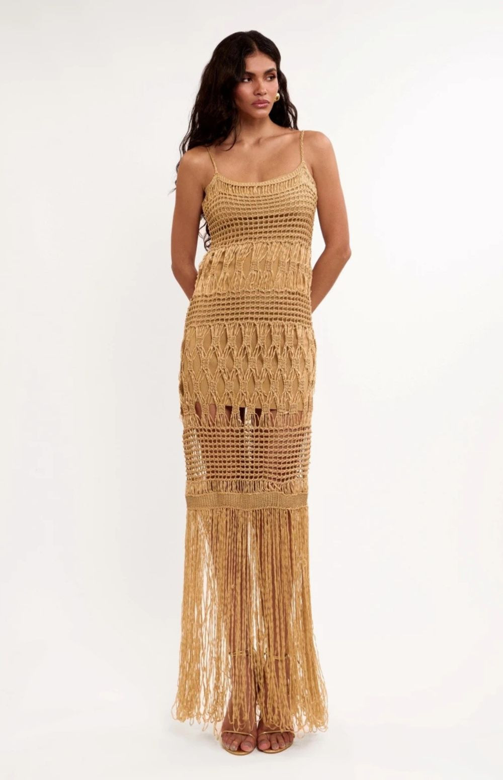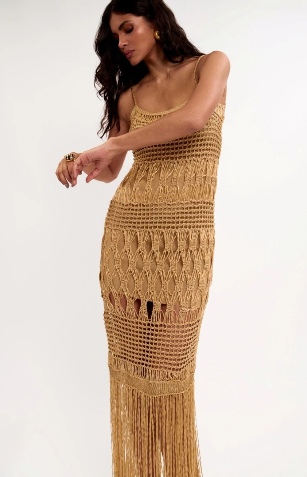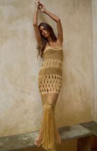 The Gold Knit Dress is the perfect choice for women who want to stand out with a look full of personality. The knit fabric provides an exclusive and handcrafted look, with a #handmade feel and openwork designs. The piece has fringes along the hem that guarantee movement to the look, with a sophisticated and exclusive design.