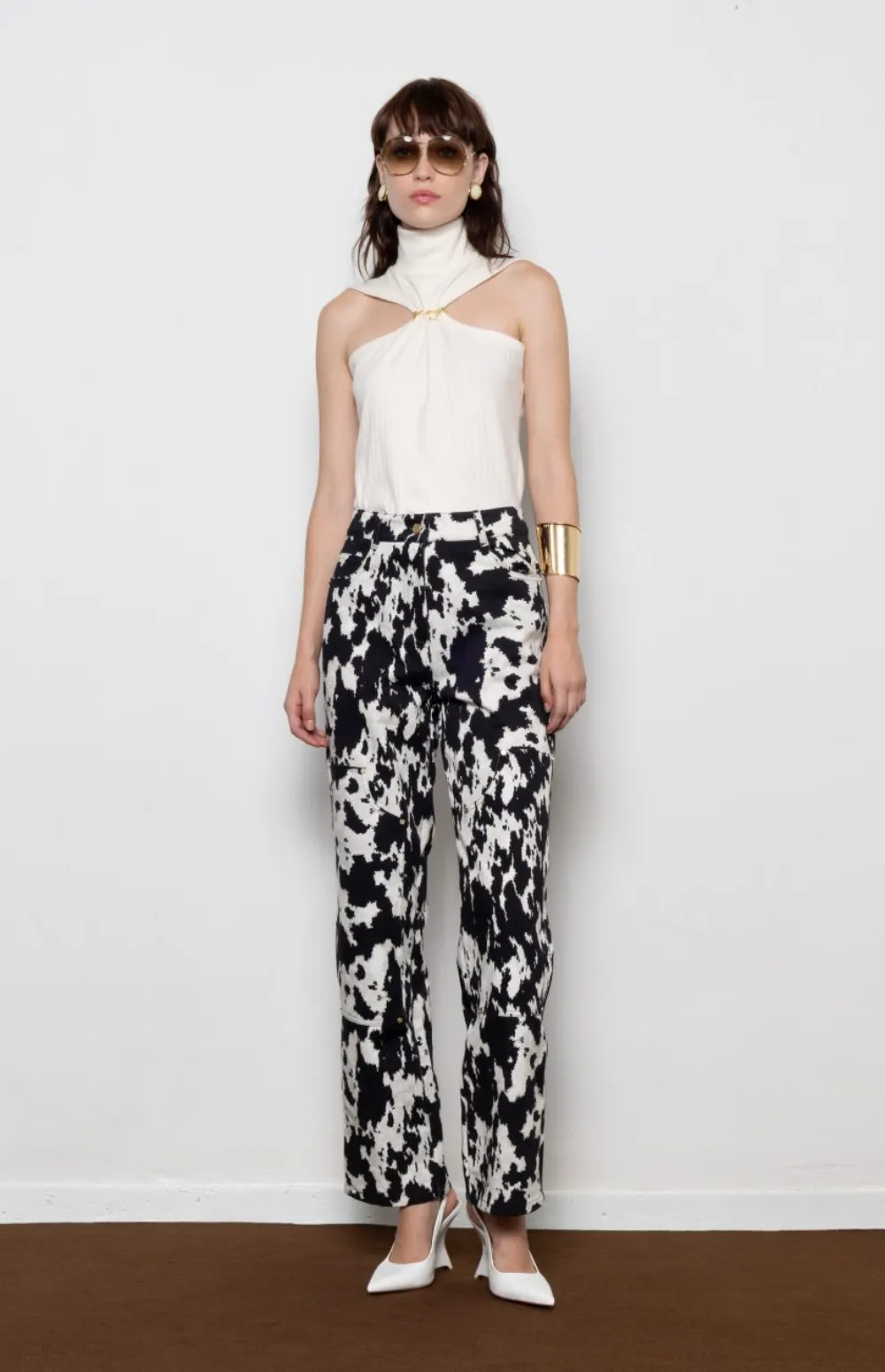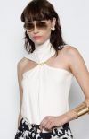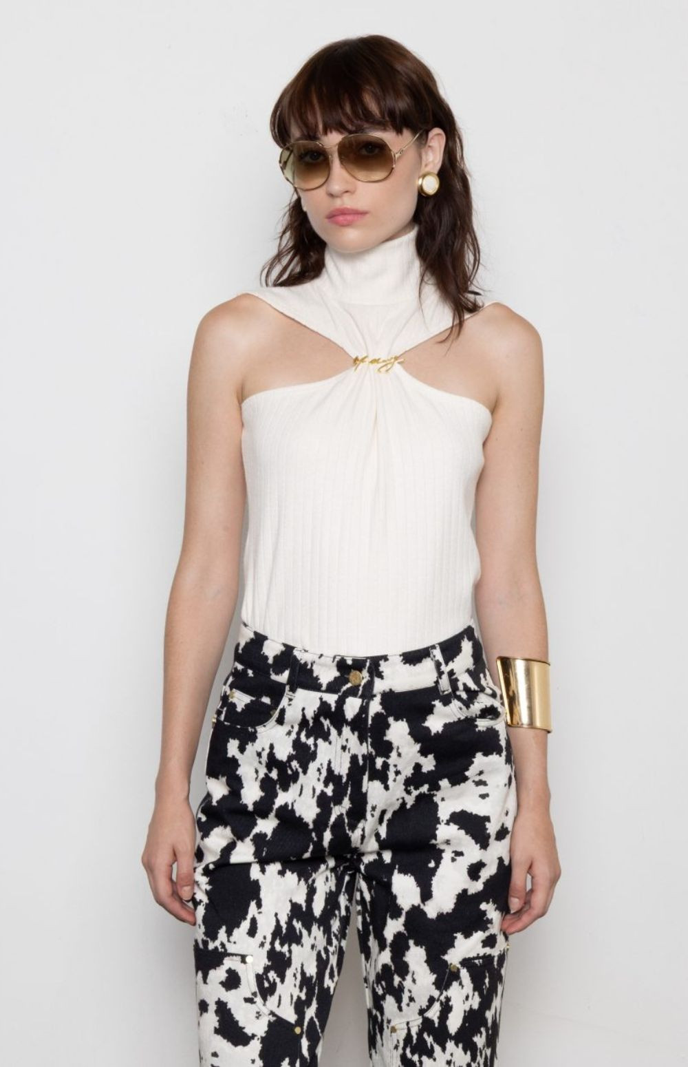 Ribbed halter top in ivory with high neck and gold MALLORY pin detail — modern, sleek, and subtly sexy.